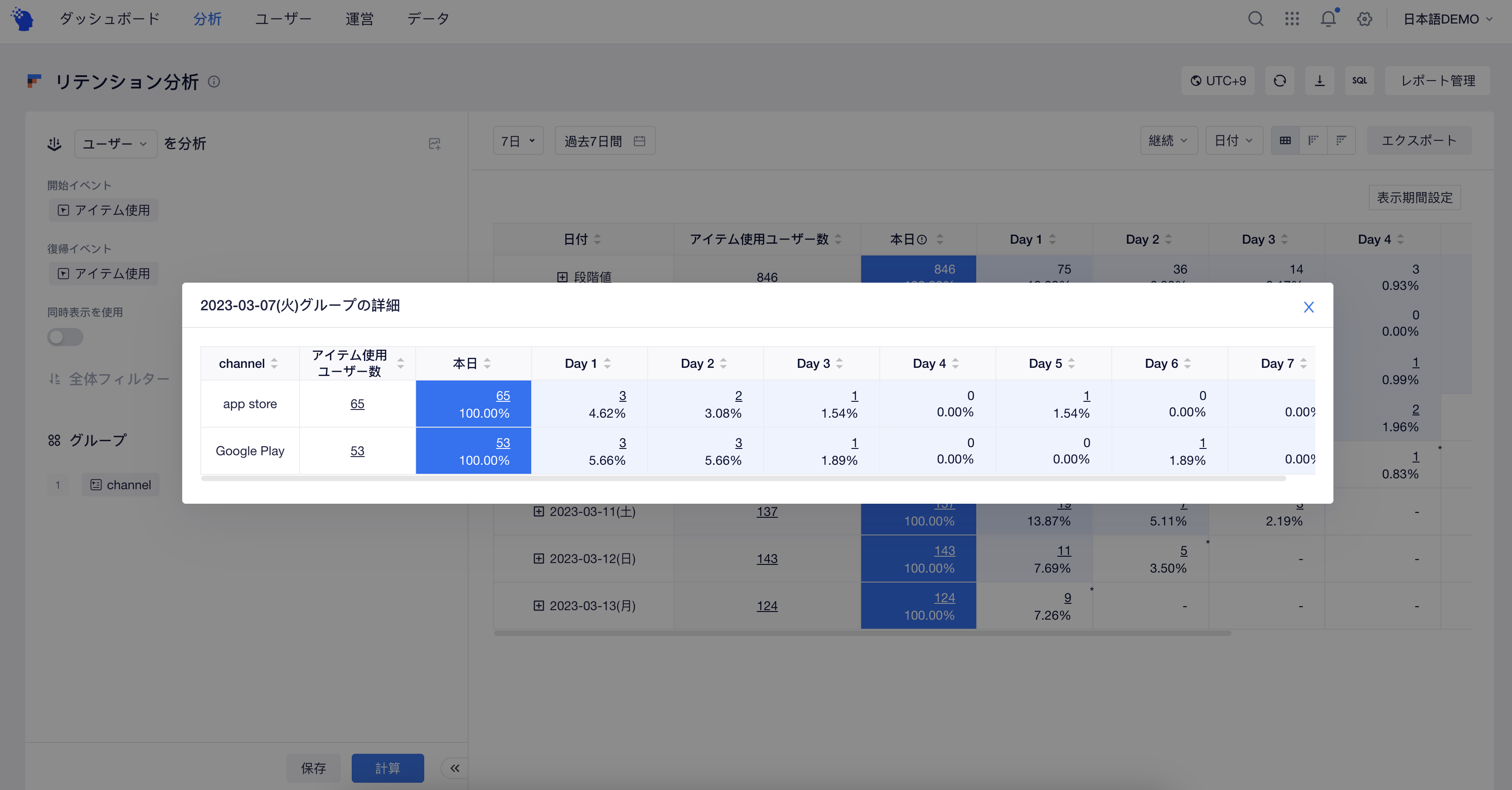 テーブルの1行目は指定期間内の集計データを示しています。集計値ロジックの説明で集計値の計算ロジックを確認できます。2行目からはそれぞれの日/週/月の継続/離脱状況が表示されます。グループ項目を構成している場合は、日付の左側にある「+」 記号をクリックし、その日付の異なるグループのデータをポップアップウィンドウで表示できます。
