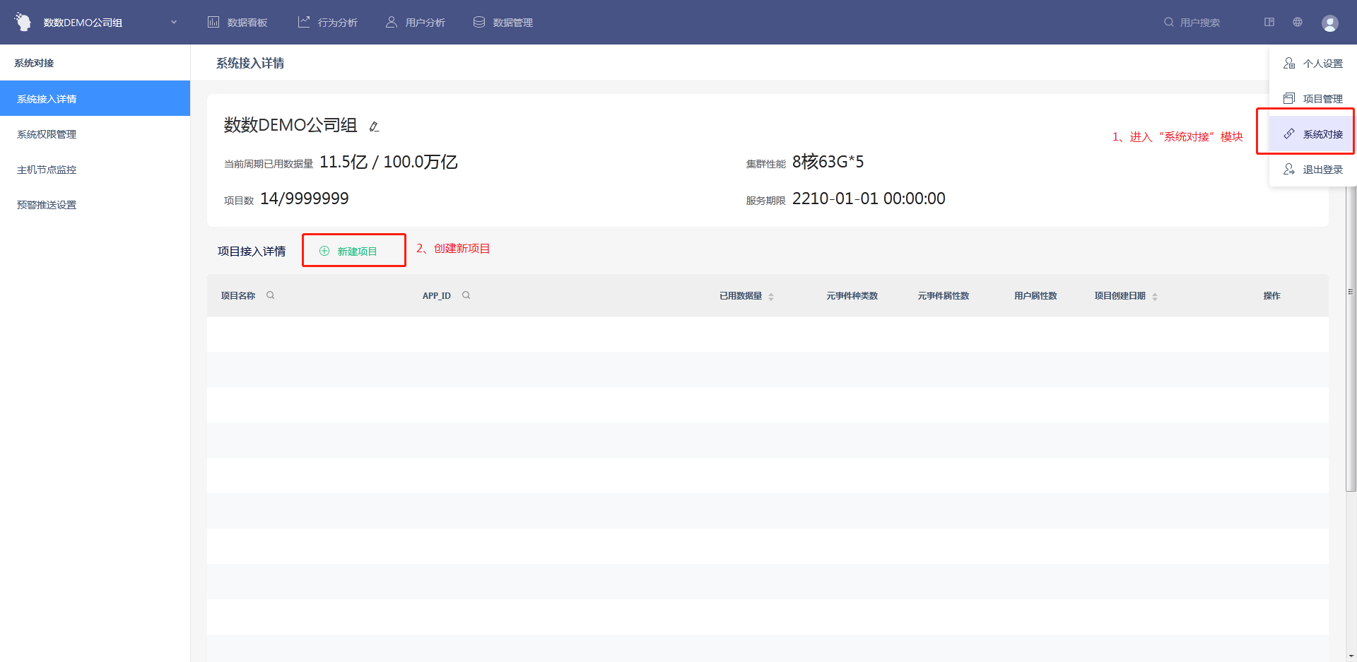 登录超级管理员账号,进入右上角管理中心的“系统对接”,进入“系统对接”功能页。