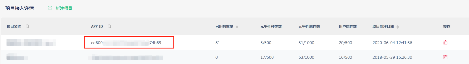 您可以在项目接入详情中查看项目对应的 APP_ID,APP_ID 将会在传输数据及清除数据时使用。