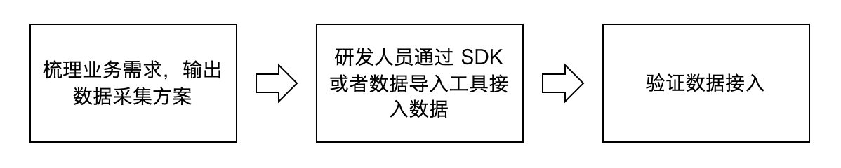 通常情况下,接入 TA 需要三个步骤:首先根据业务需求的整理,梳理出数据采集方案,数数科技的分析师会协助您完成这一部分工作;然后,由研发人员根据数据采集方案完成数据接入工作;最后是验证数据接入正确性。该接入流程如下图所示: