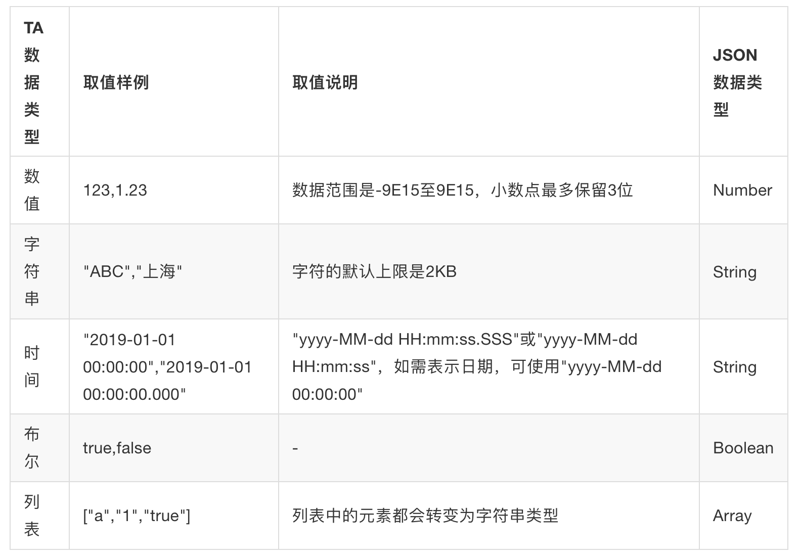 注意:在 TA 后台,属性值的类型会根据第一次收到该属性值的类型确定,后续如果数据中某个属性的值的类型与此前确定的类型不符,该属性将被丢弃。
