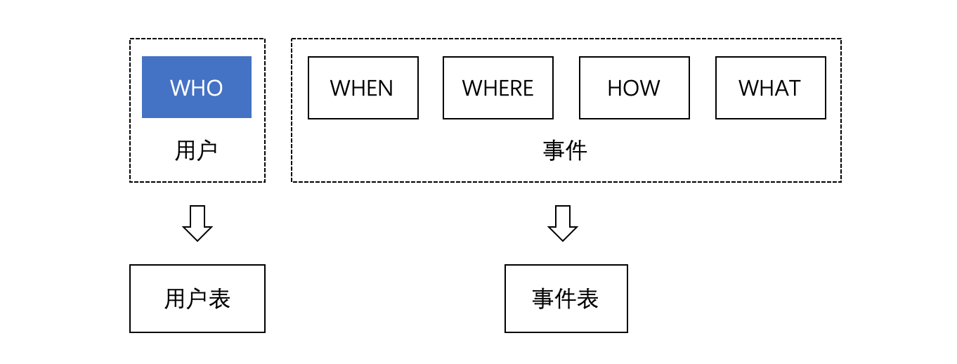 数据采集方案的设计实际上就是根据业务分析的目标确定采集哪些用户行为事件的过程。例如,如果要分析用户充值情况,要采集的可能是用户支付行为数据。用户行为数据可以分解为:谁 (WHO),什么时候 (WHEN),在哪里 (WHERE),以什么方式 (HOW),进行了充值行为 (WHAT),如下图所示: