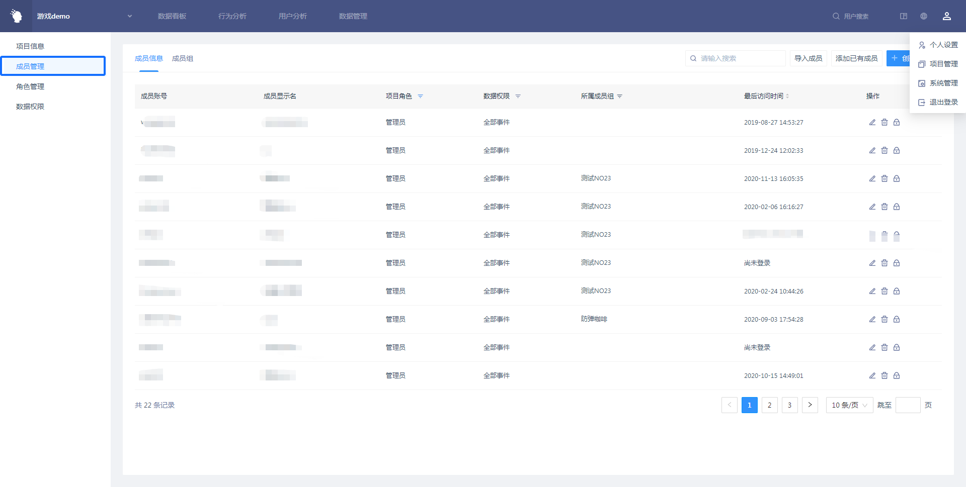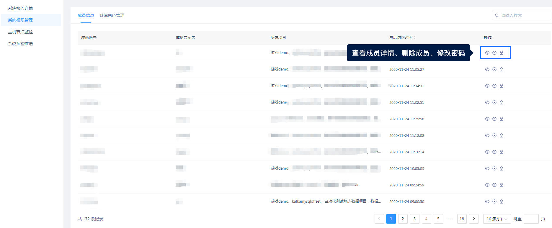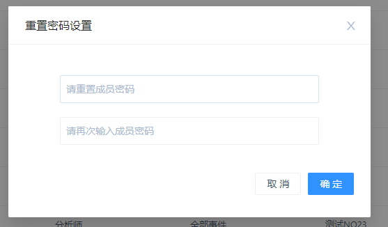 可查看该项目下的所有成员,管理员可对低层级成员进行权限编辑。公司超管可对项目成员进行重置密码的操作
