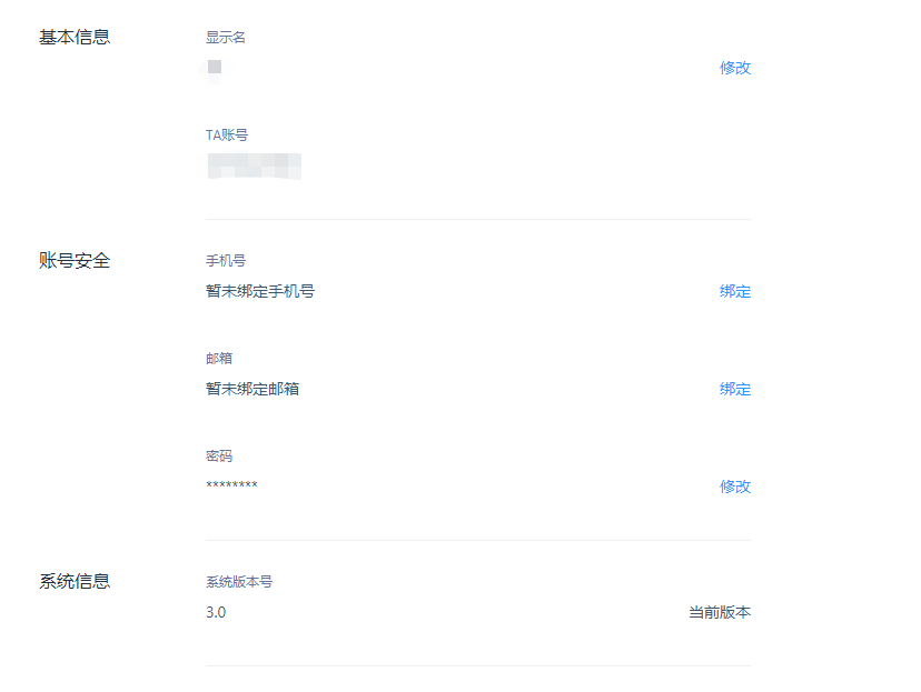 可在账户信息页面配置个人信息,包含账户名称、邮箱信息、并可以修改密码。