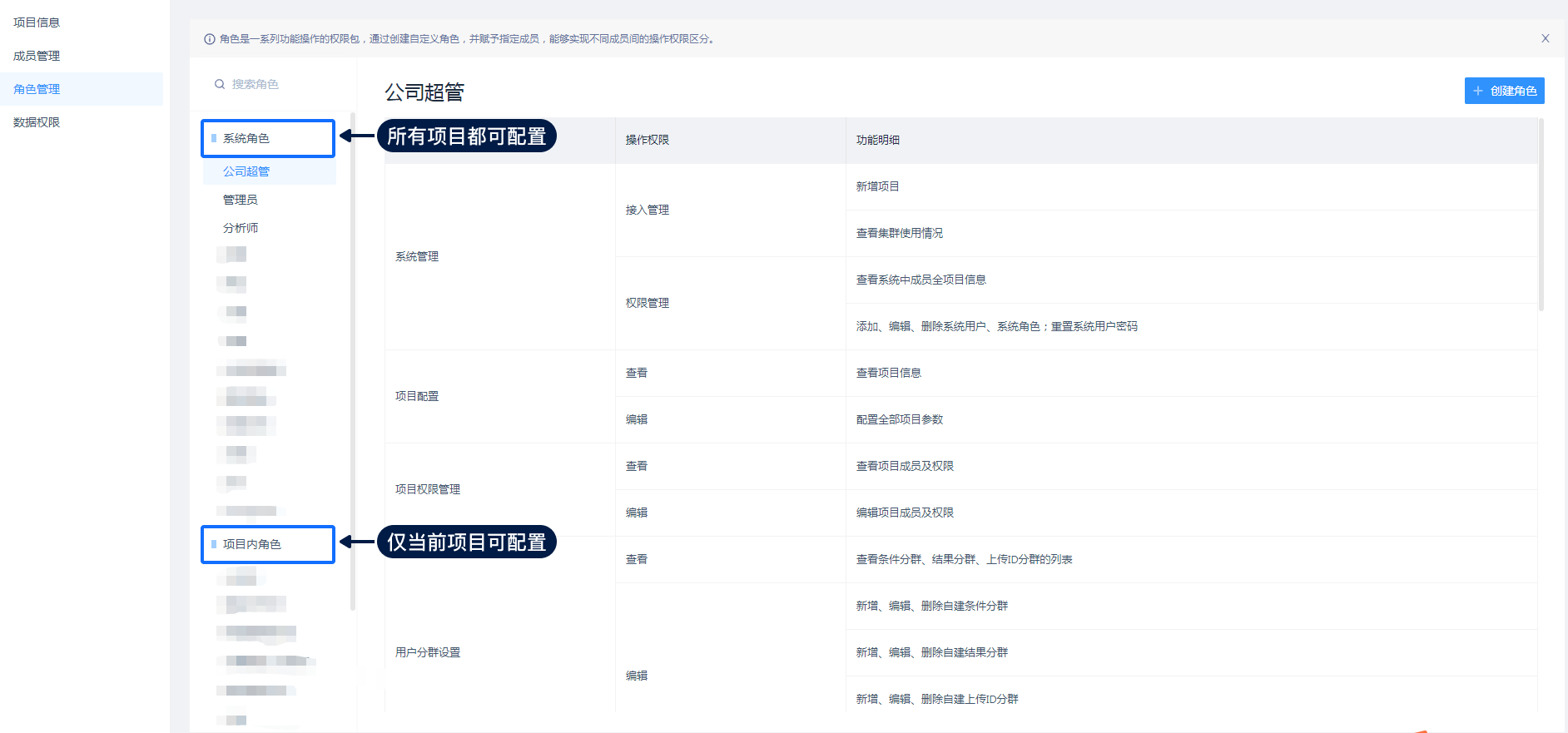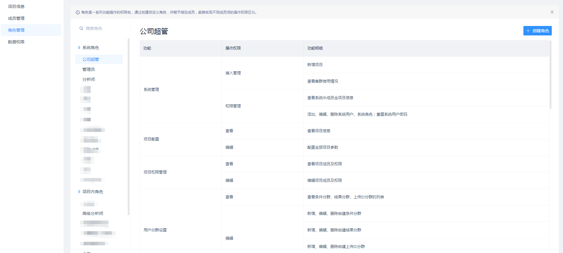 如超管、管理员、分析师、普通成员都是项目中默认的角色