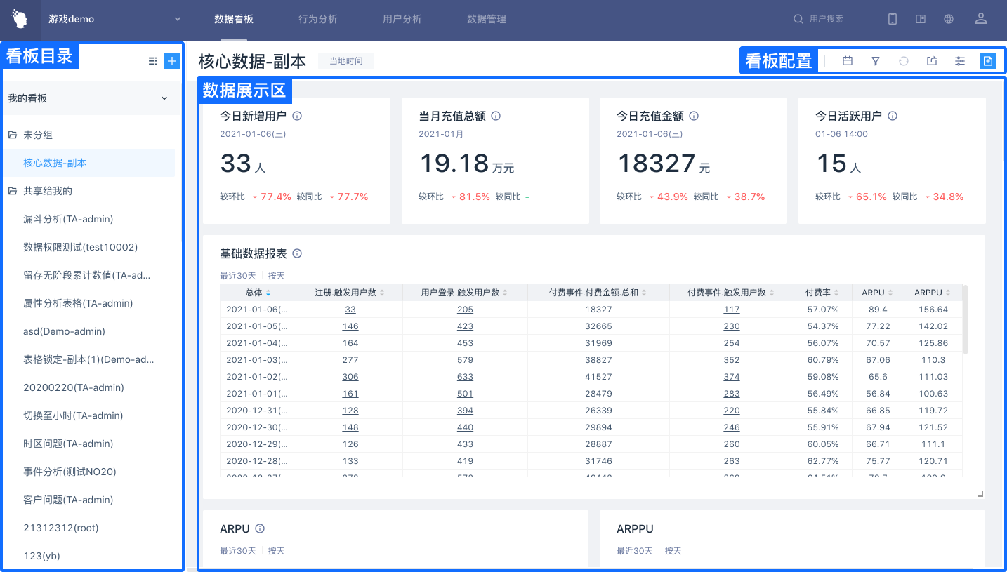 数据看板由三部分组成:看板目录、看板配置区、数据展示区
