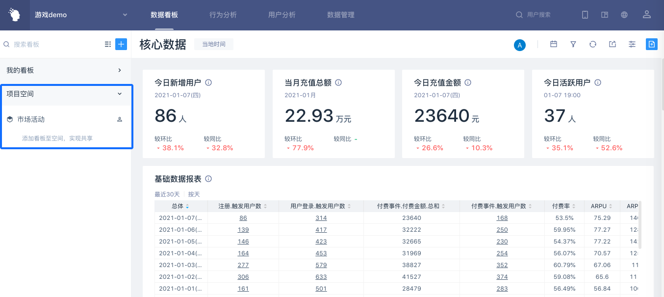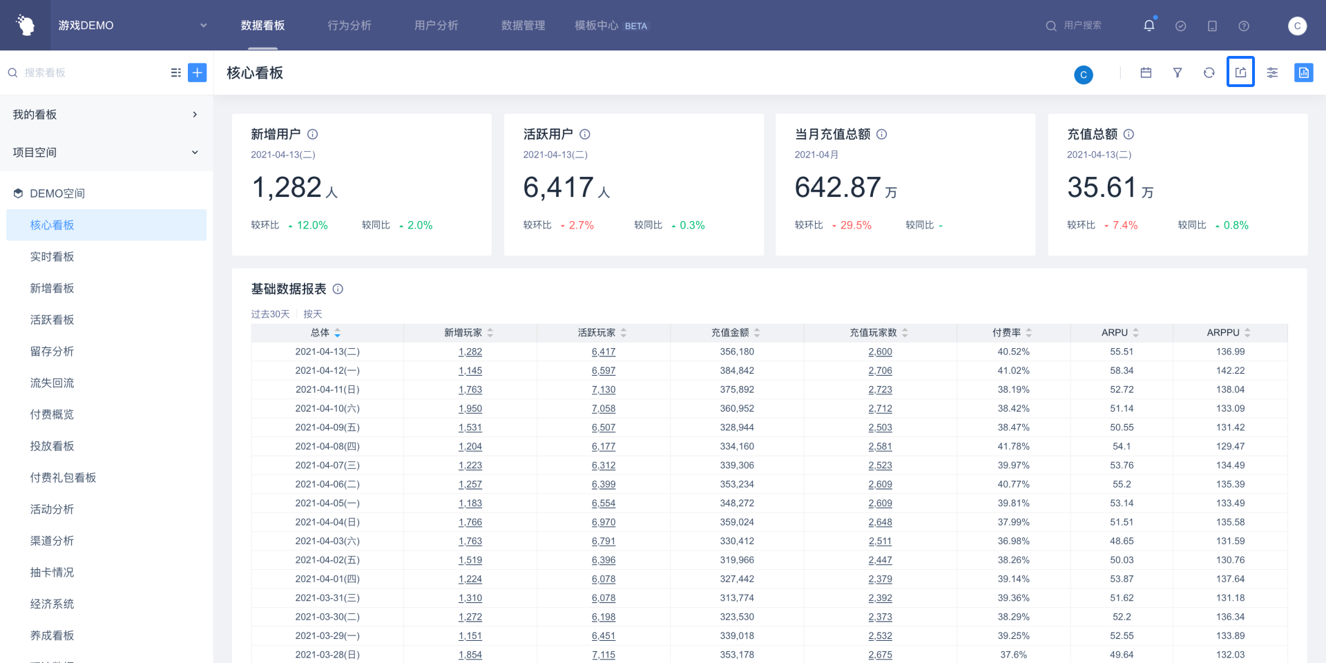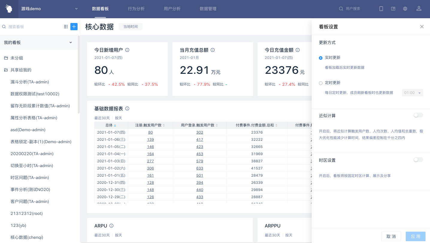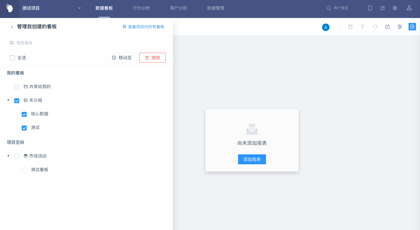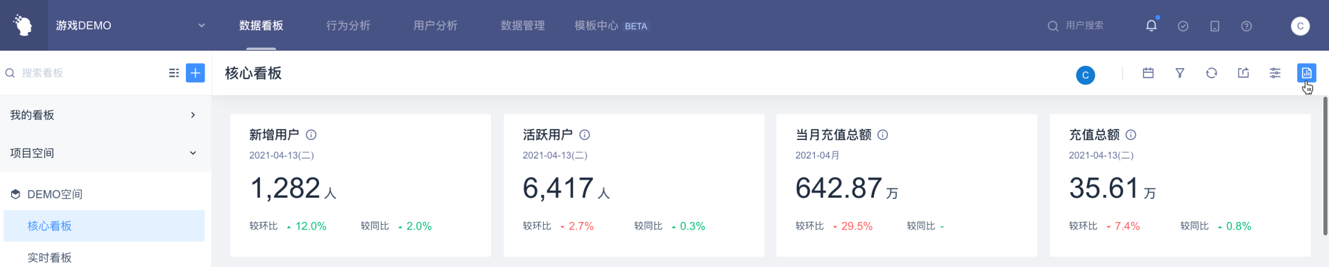 看板为报表的集合,在日常平台使用过程中,将分析指标保存为报表,添加至看板中,方便日常数据的监控。TA 支持将同一张报表放进多张数据看板。