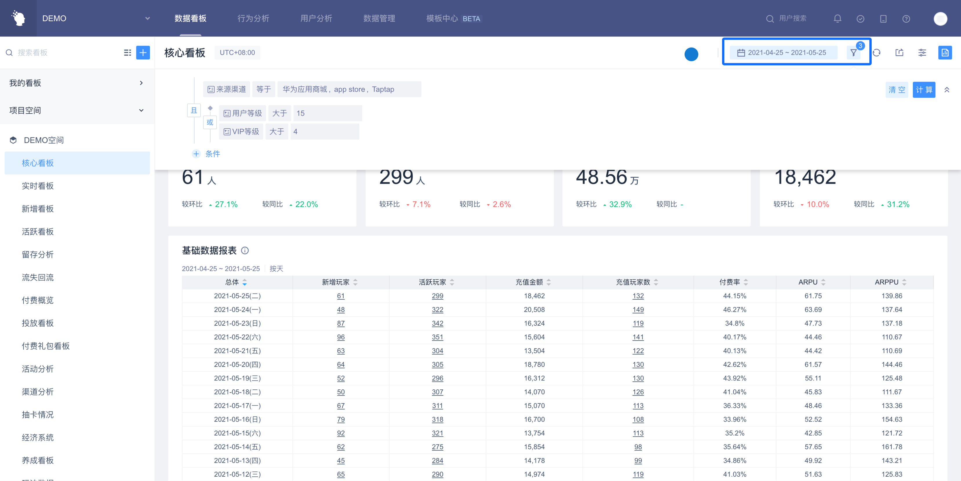 看板筛选可以对看板中所有的报表进行筛选,适合用来对特定人群进行分析。在分析前,可以在看板中放入多个用来分析不同用户维度的报表,比如活跃度报表、付费报表以及产品核心行为的参与情况报表。之后可以通过筛选用户分群或者用户标签,对看板中的这些报表进行筛选,相当于查看筛选条件所圈选的人群的报表数据,以此快速地对特定人群的各个分析维度进行分析。