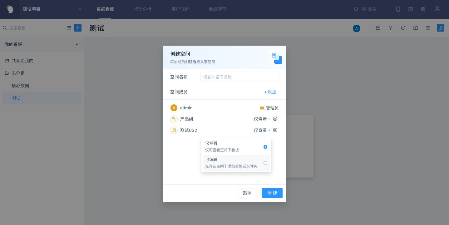 - 在创建空间弹框中选择空间成员、设置空间成员权限。空间内看板对空间成员默认可见。