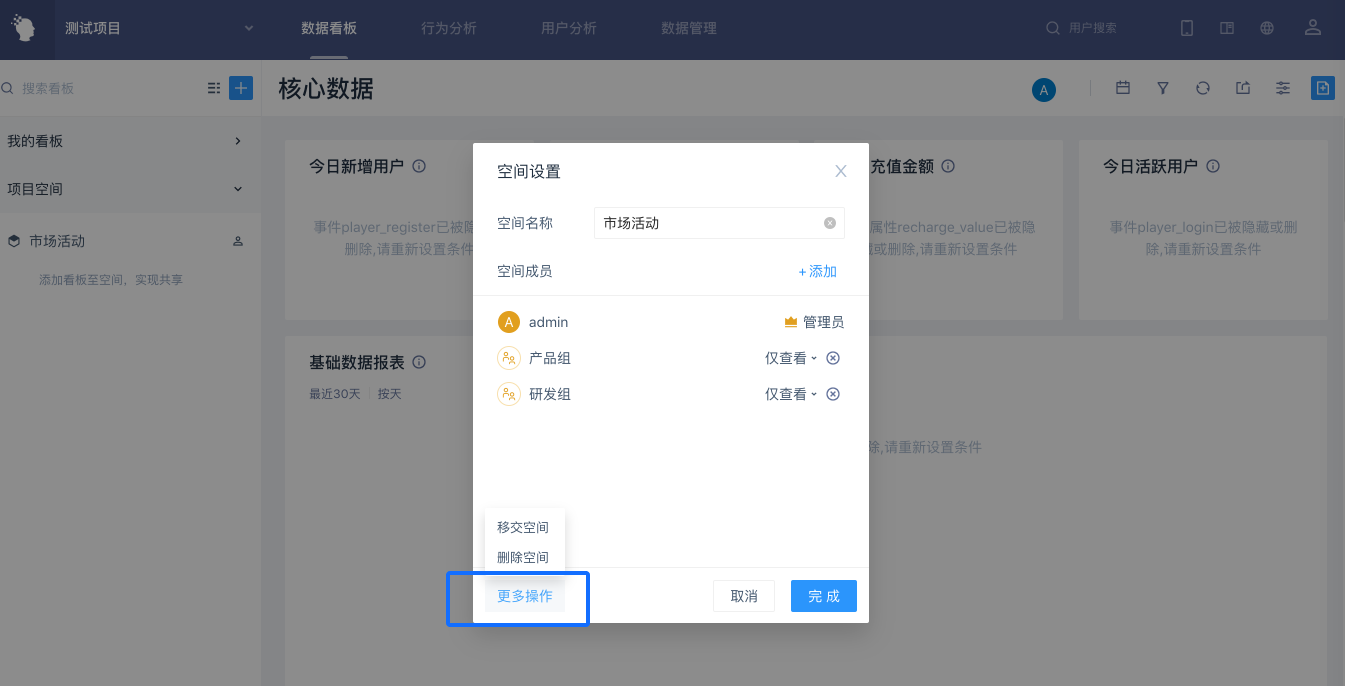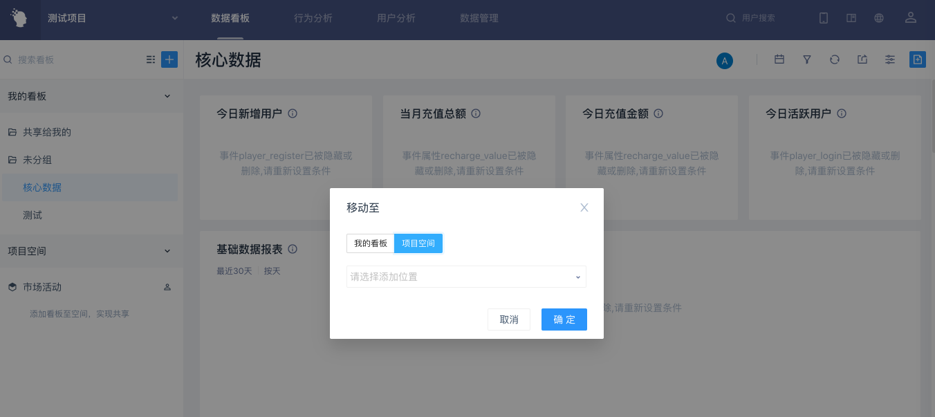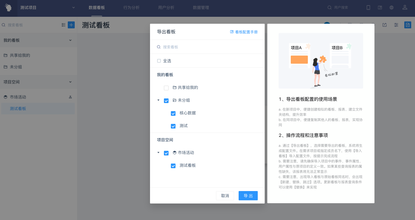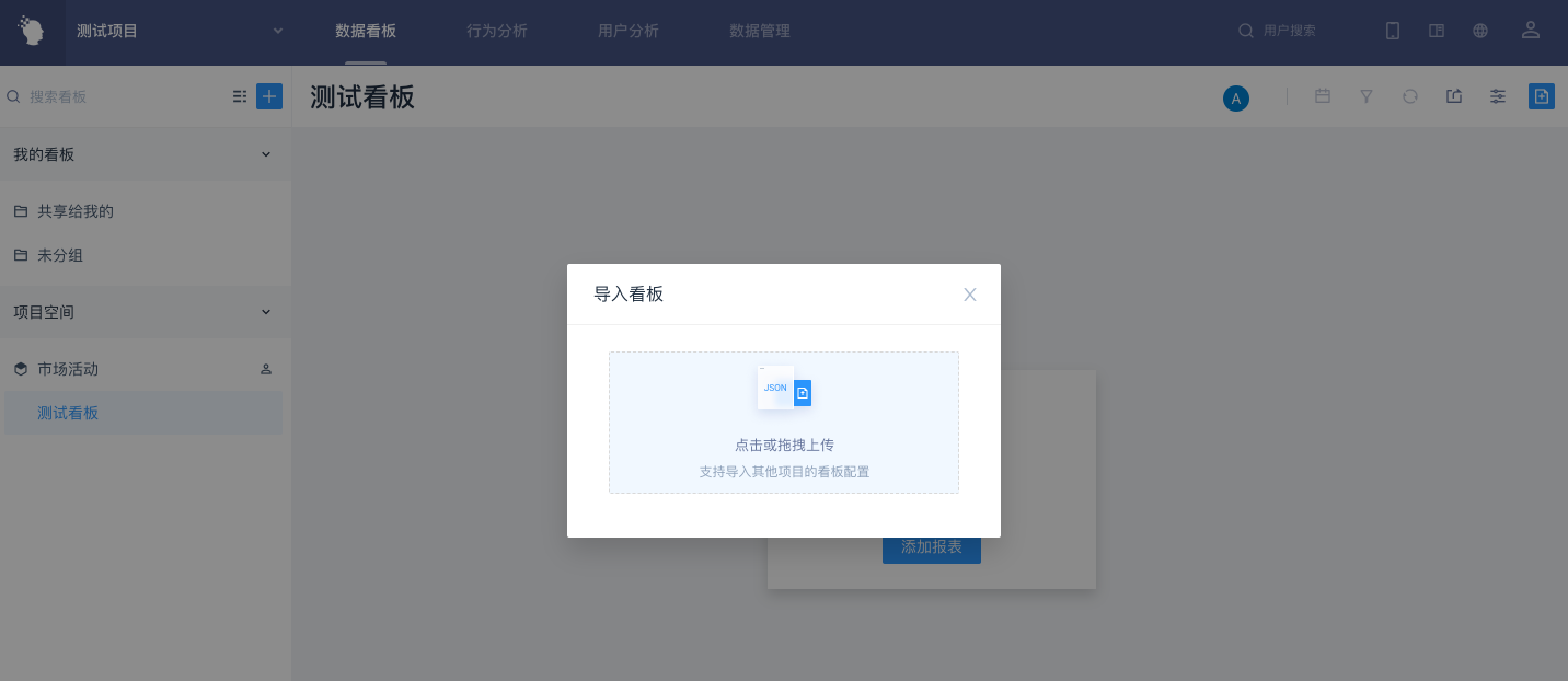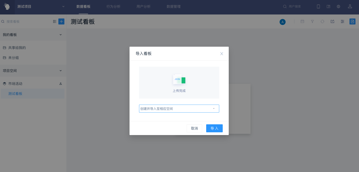 TA 支持将看板、看板报表以及空间的配置信息导出成 JSON 文件,并支持在任意项目中导入,实现空间、看板、报表的快速迁移。