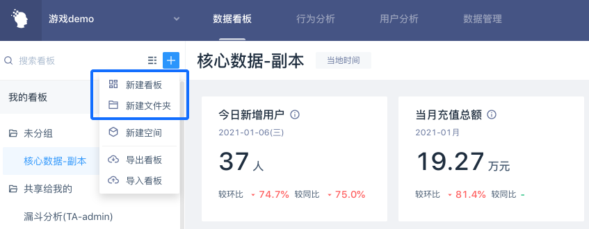公司超管、管理员、分析师或其他拥有看板创建权限的成员,可在看板左侧栏点击右上角[+],选择“创建看板”或“创建文件夹”。