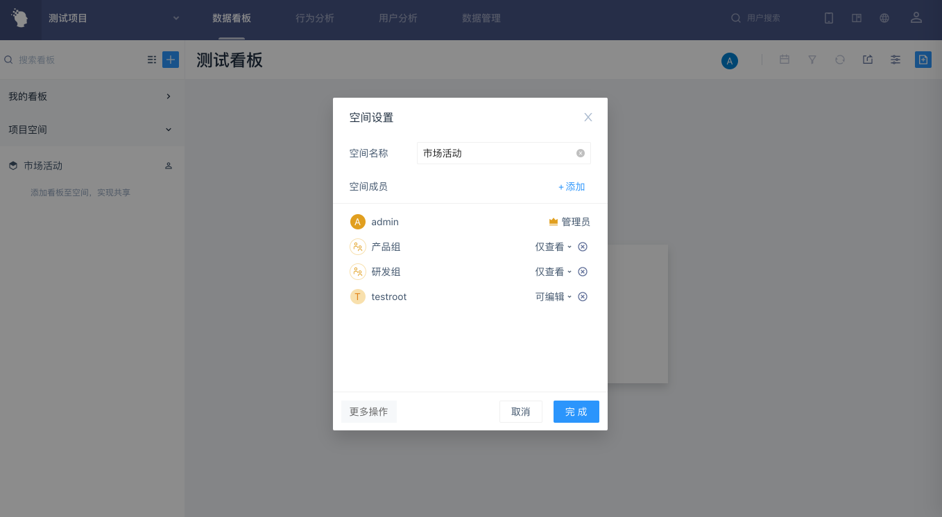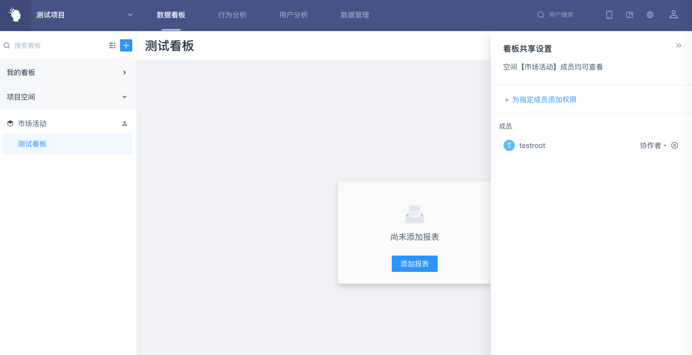 TA 支持将自建看板共享给团队内其他成员,添加其他成员作为看板协作者,共同进行看板编辑,实现团队成员的协作。