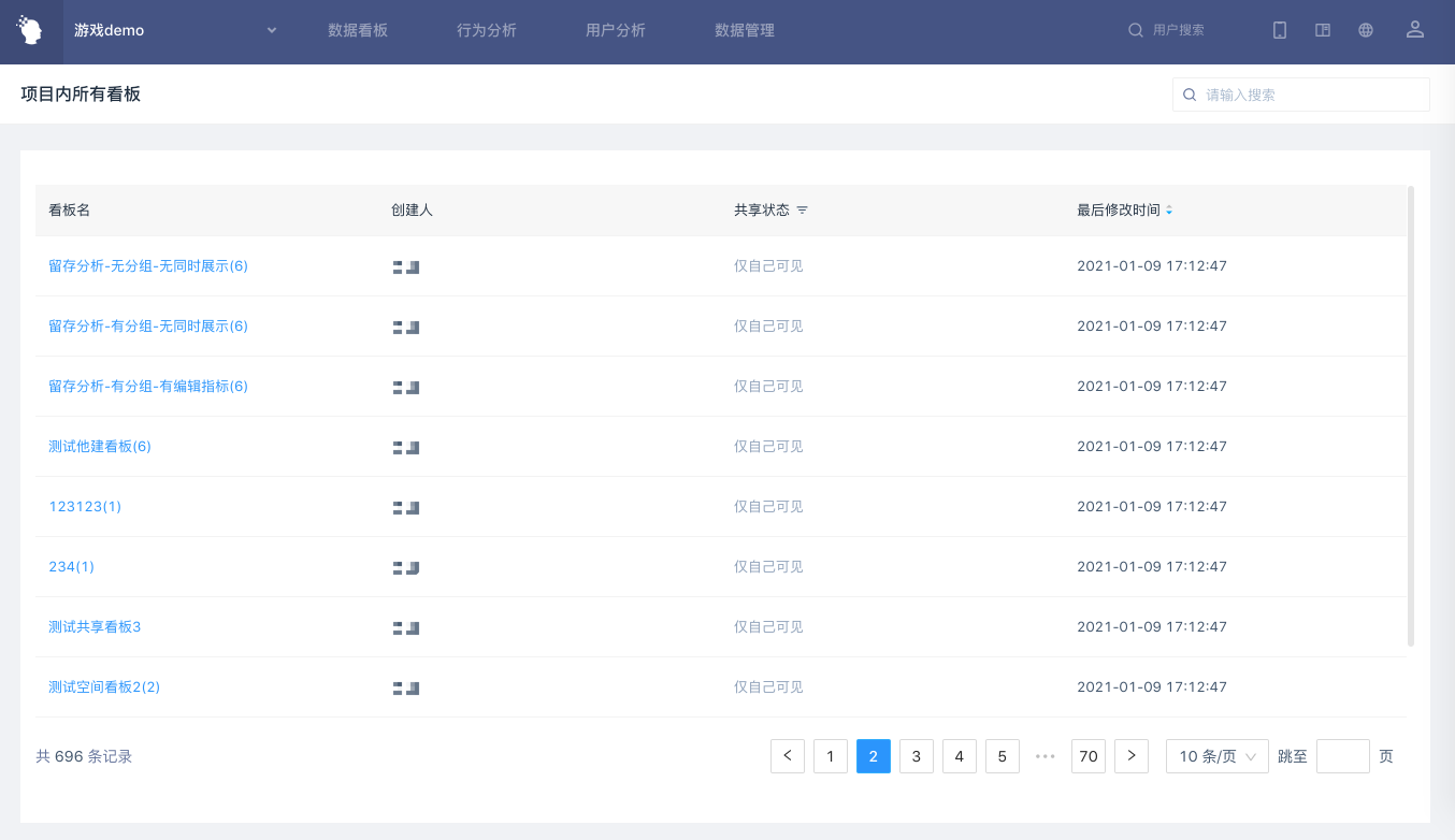 TA 超管可通过该模块进入查看项目内全部看板,看板信息包括看板名称、看板创建人、看板的共享状态和最后修改时间,点击看板名称可进入查看看板明细。