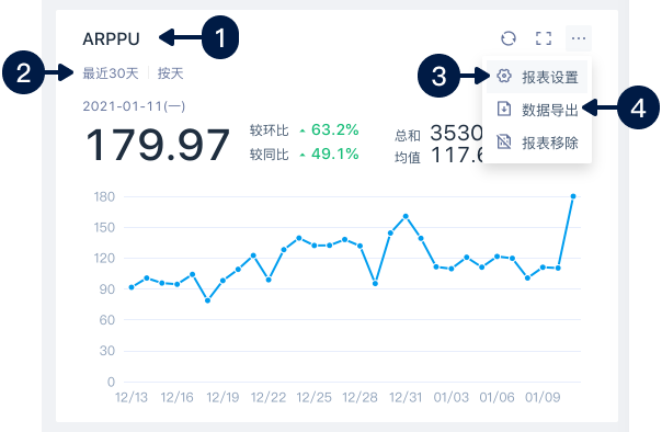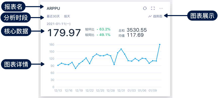 任意看板报表都由配置区(报表名+时间设置+分组设置+下载与设置+图表样式设置)与报表内容组成,无论哪种模型的报表都有报表名、时间设置、下载与设置。图表样式设置项与所选模型有关。