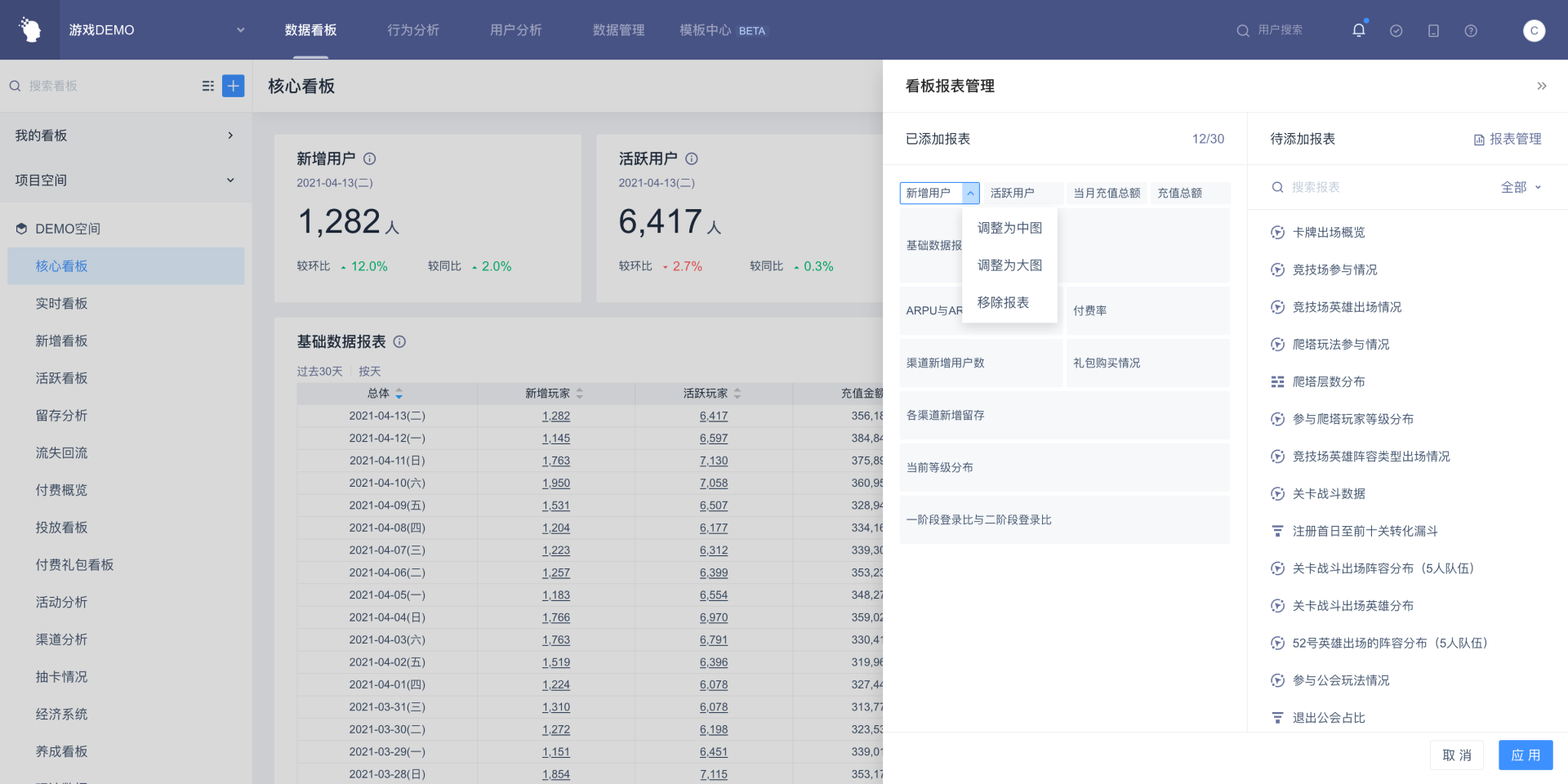 - 在左侧已添加报表中,悬停在报表缩略结构上,点击结构右侧部分可展开操作菜单,可调整报表大小以及移除报表;另外,可以在此处通过拖拽调整报表位置。