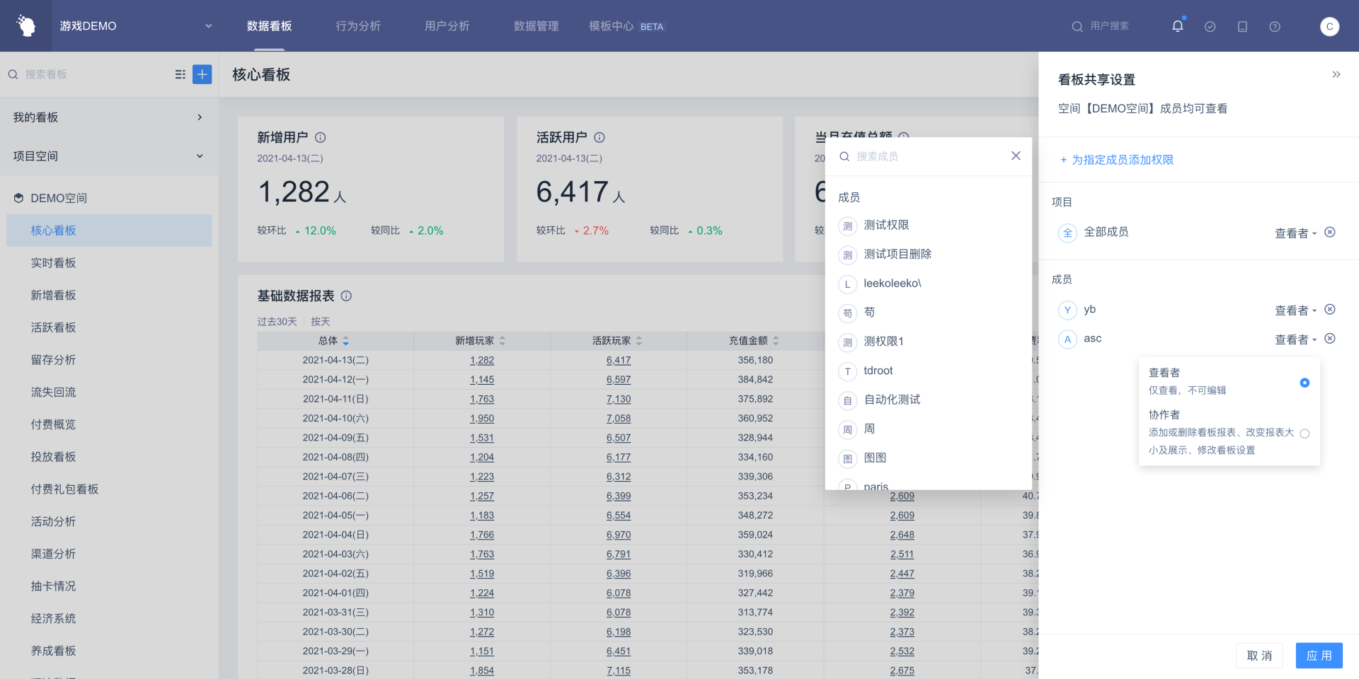 添加的共享对象默认仅具有看板查看权限,无法修改看板内容及展示。点击已选成员或成员组后的[查看者],可切换共享对象的权限为[协作者]。