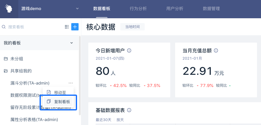 在看板使用过程中,若希望在某看板基础上做进一步的分析调整,可使用复制看板功能。默认 TA 超管、管理员及分析师具有复制看板的操作权限。