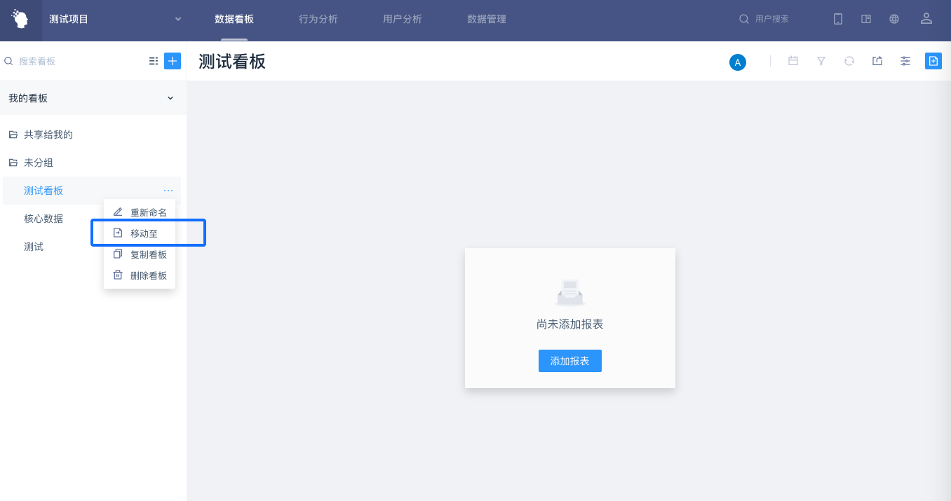鼠标移入「我的看板」下的自建看板,点击[…],选择“移动至”,可将看板移动至有编辑权限的空间。