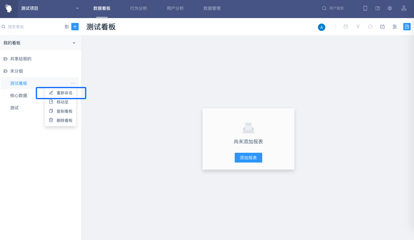 鼠标移入自建看板或文件夹,点击[…],选择“重新命名”,即可对看板或文件夹进行重命名。