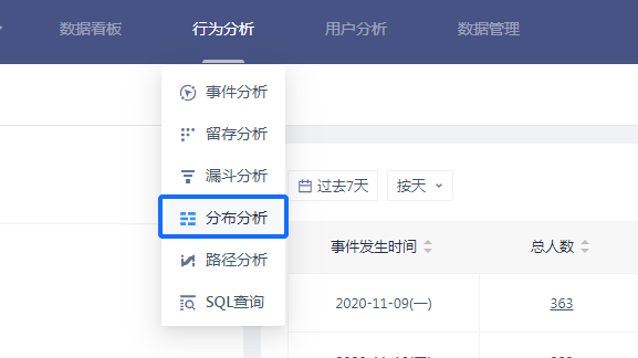 在顶部导航栏中的“行为分析”中选择“分布分析”,即可进入分布分析模型: