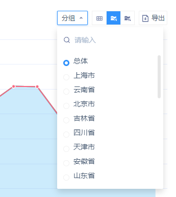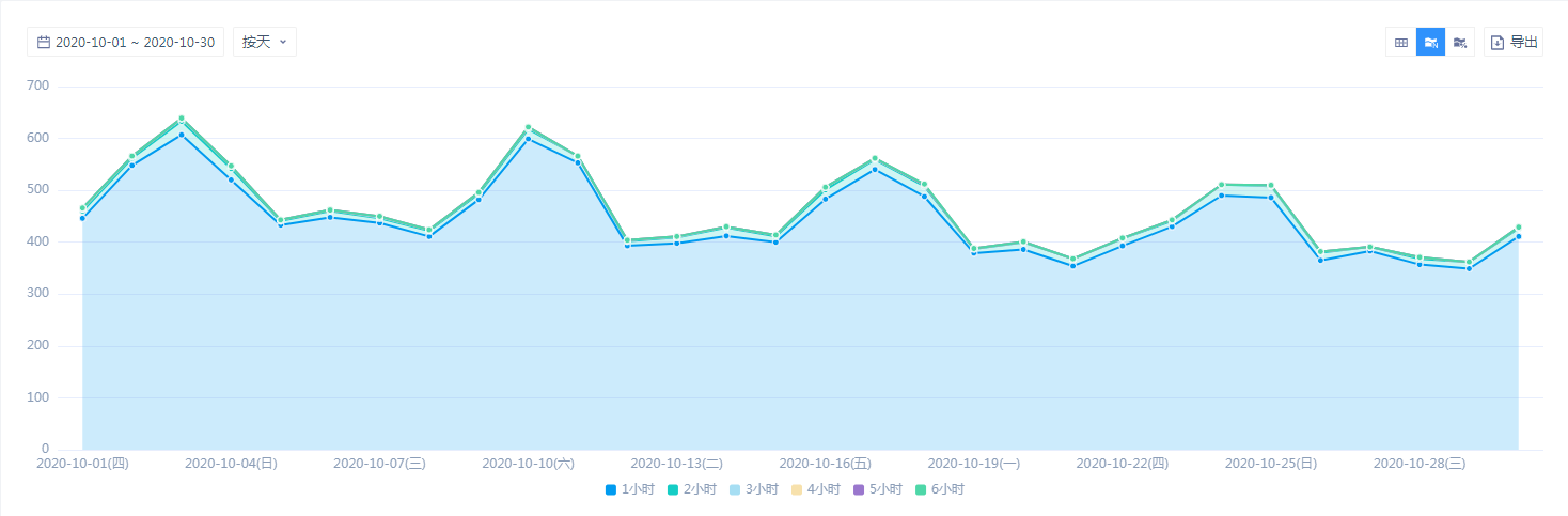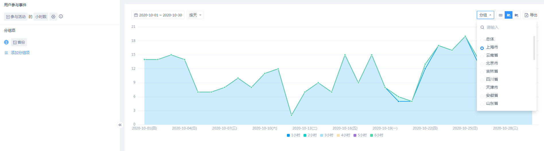 有分析时段、分析粒度、分组选中项、图表样式可供选择,可导出表格或全量下载数据。