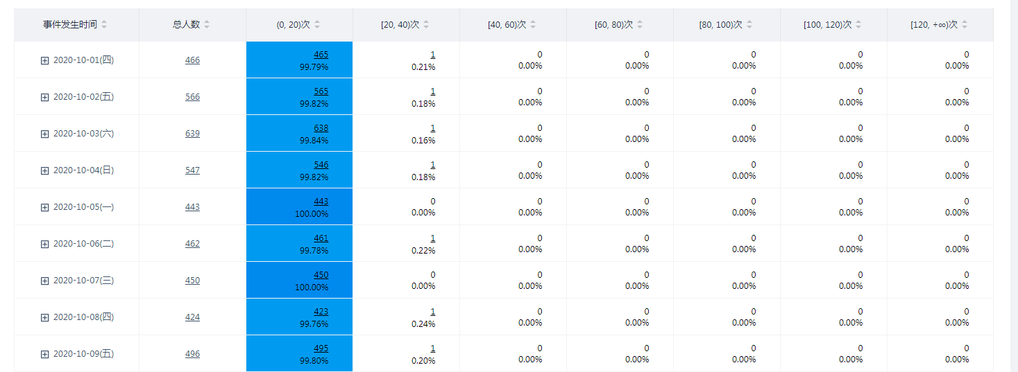 分布分析可以解决在一定时间内,指定用户完成某一事件按个人聚合后的总完成次数或属性值进行分值分类的情况。