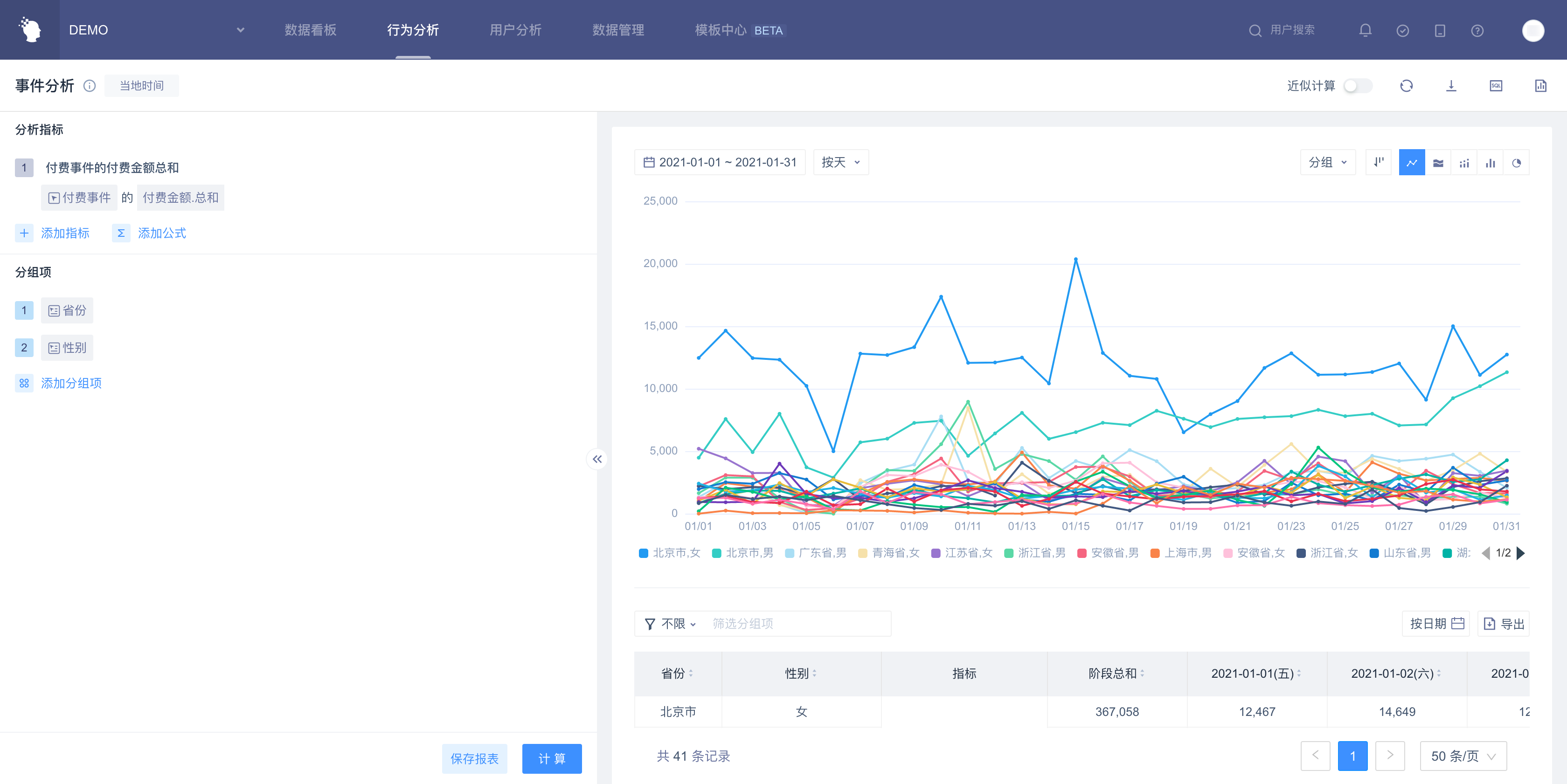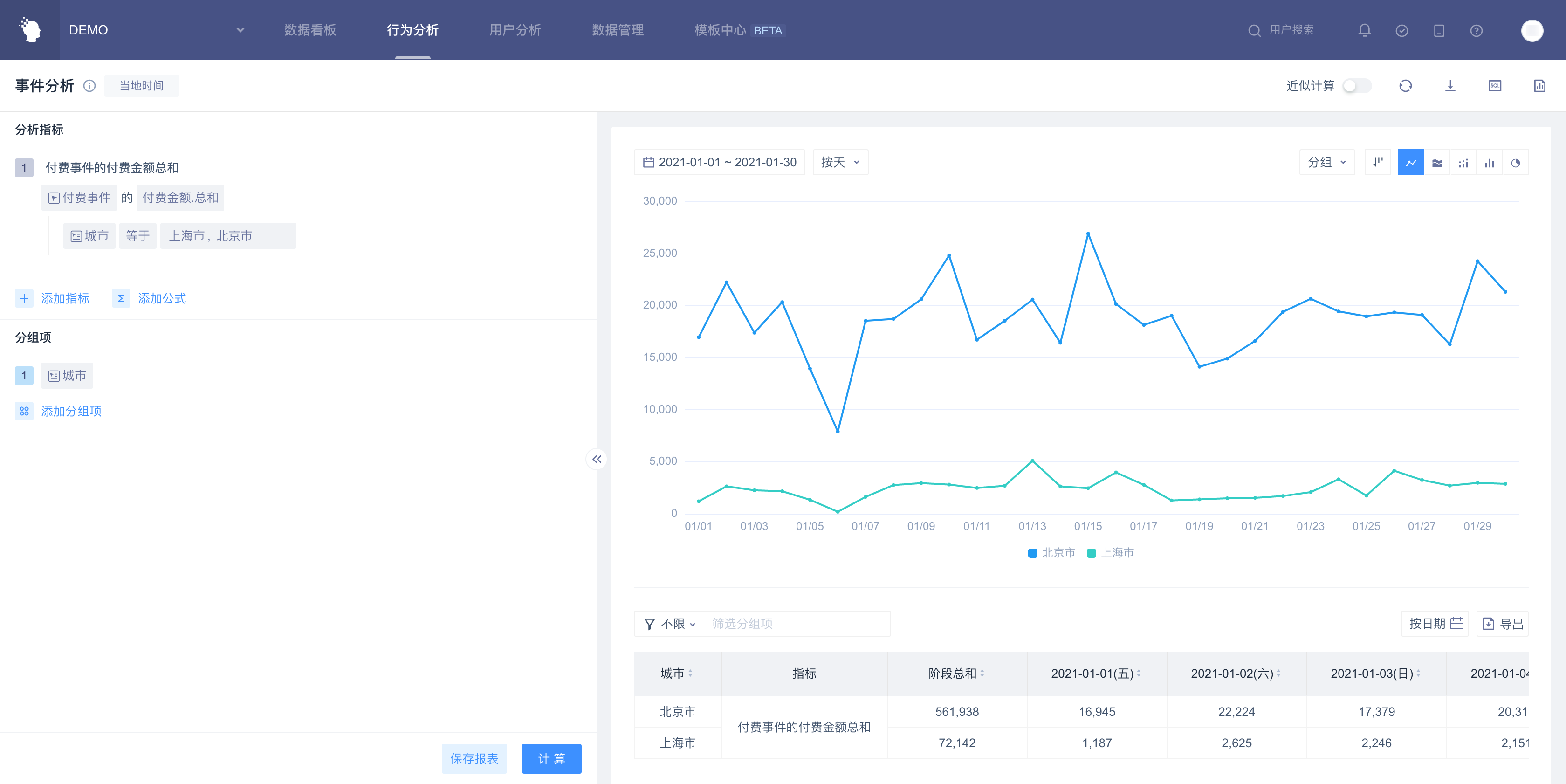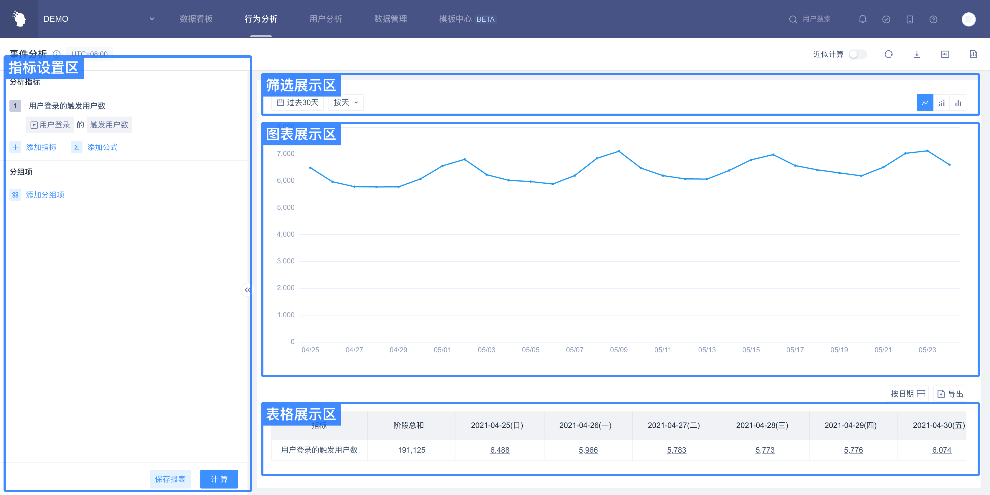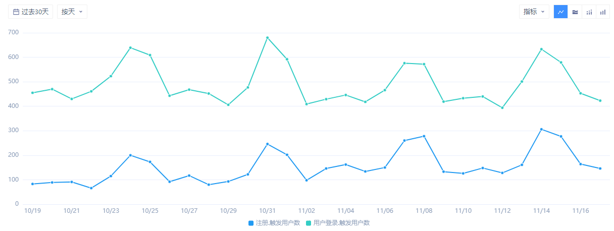 通过事件分析,可以计算一段时间内用户产生特定行为的聚合指标,了解各行为的用户参与情况以及指标的发展趋势,从而对产品获得宏观把控,优化决策。