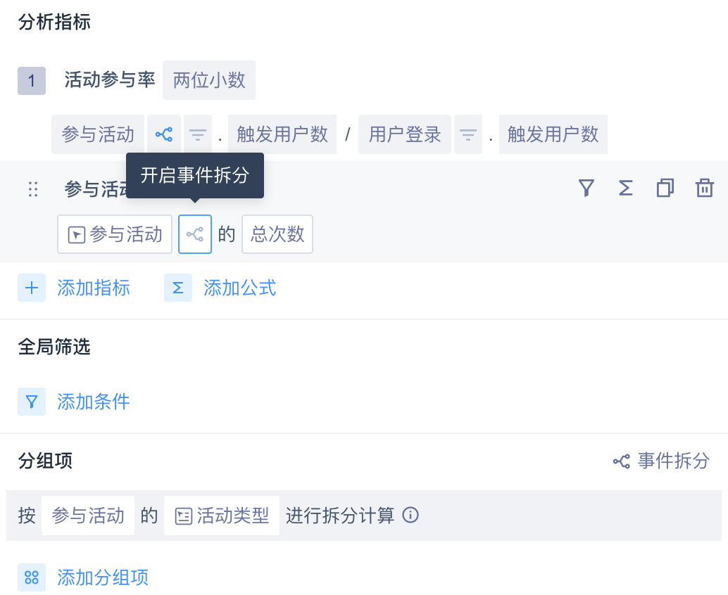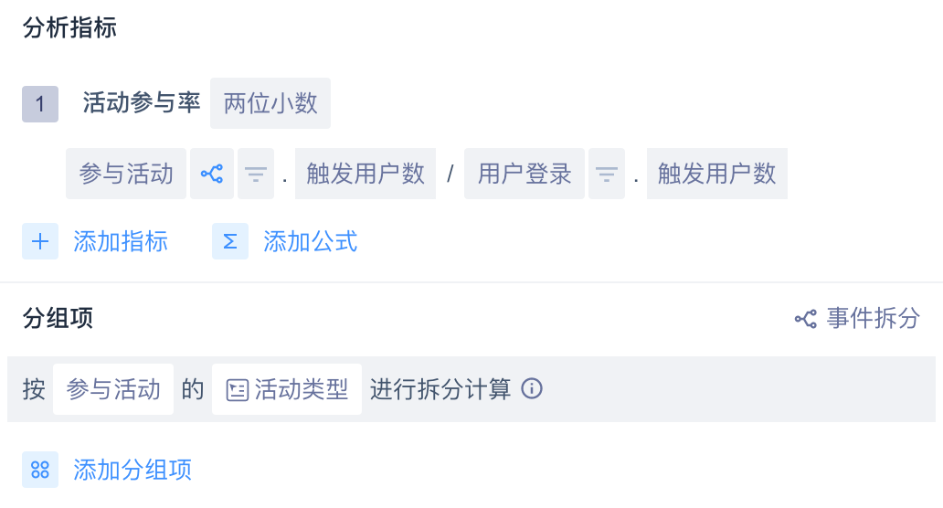 如下图,公式中的指标参与拆分,非公式指标不参与拆分,即为计算活动的总参与次数以及不同活动类型的参与率。
