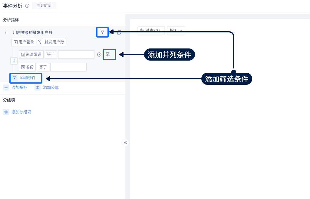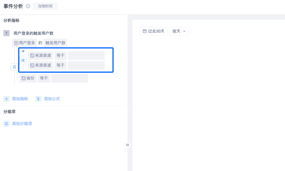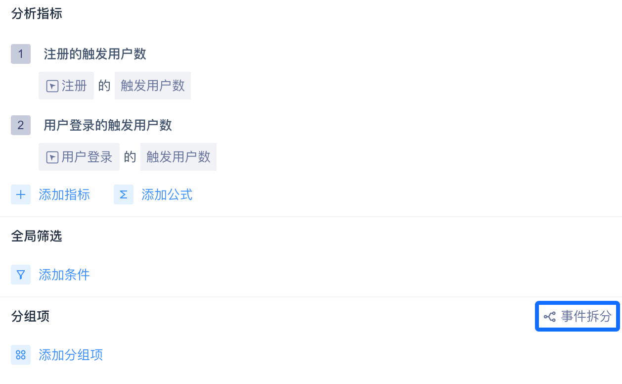 “分组项”的设置对分析对象中所有事件进行分组,“事件拆分”解决只需对分析对象中某一事件进行分组统计的需求。