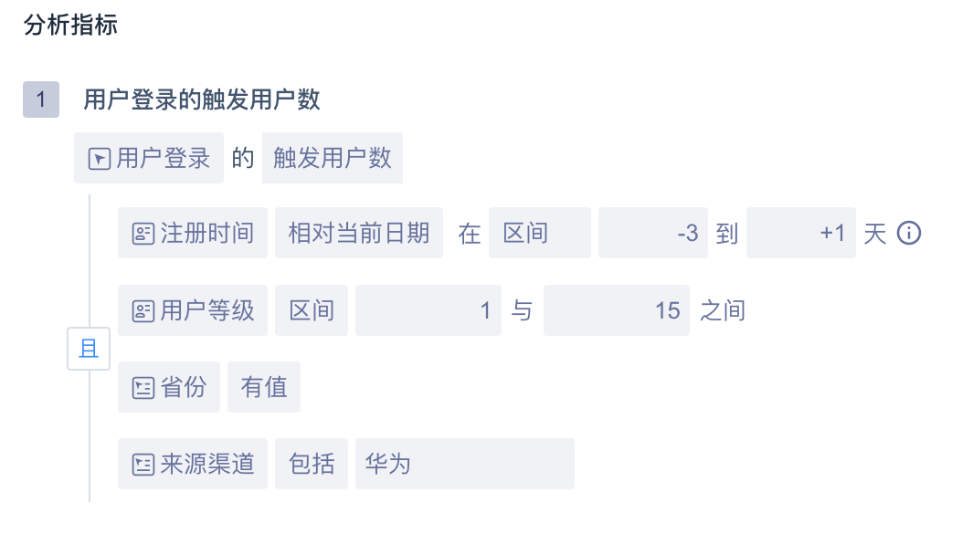 通过分析指标的“指标筛选”可选出符合某些特征的事件或用户进行分析,V3.2.1及以上版本支持筛选条件的两层逻辑嵌套: