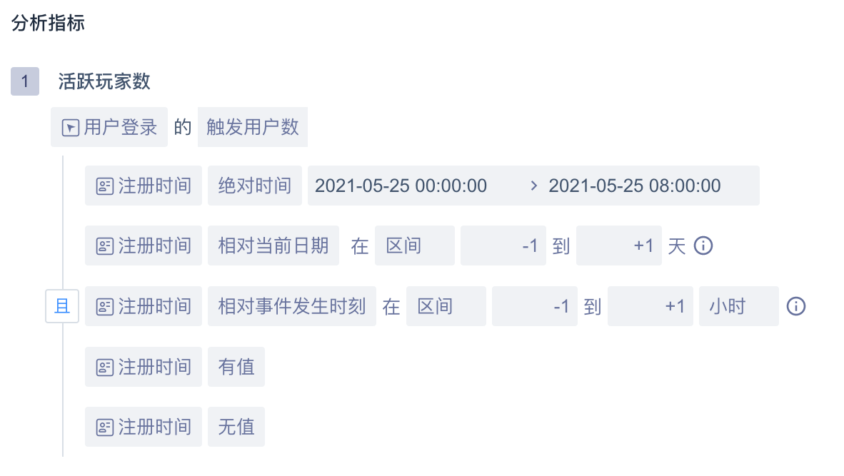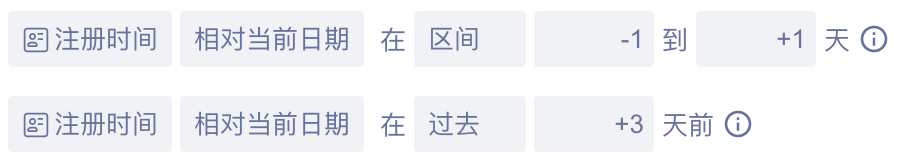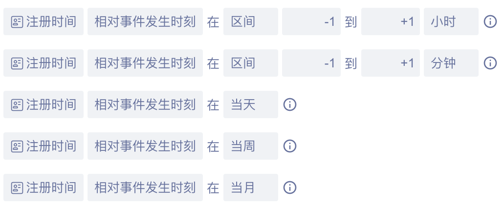时间 | 注册时间(yyyy-MM-dd HH:mm:ss.SSS 或 yyyy-MM-dd HH:mm:ss) | 绝对时间、相对当前时间、相对事件发生时刻、有值、无值 |