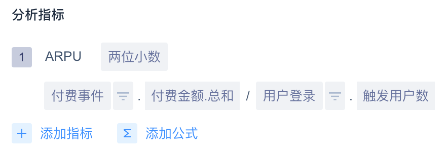 如果需要进行分析指标间的一些四则运算,可以通过”添加公式“来实现。如分析 ARPU 值(活跃用户的人均付费金额):