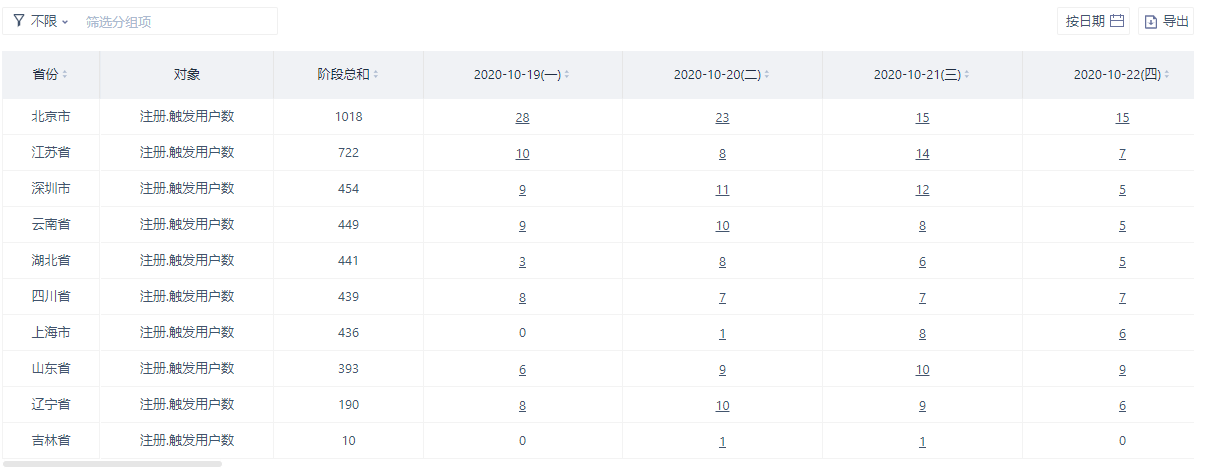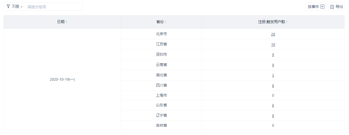 任意事件 | 总次数、触发用户数、人均次数 | |