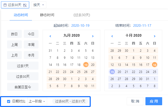 (2)默认选择方式为“上一阶段”,并按照动态或静态时间直接给到对应的日期