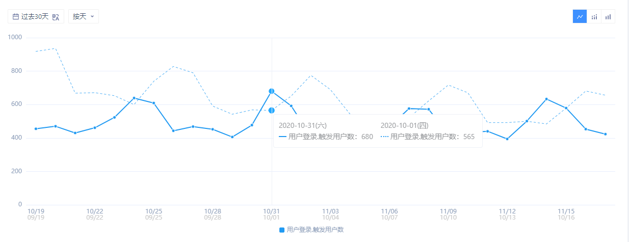 有日期对比时,只能选择趋势图或分布图或累计图。如果从其他图表类型切换,默认切换趋势图。