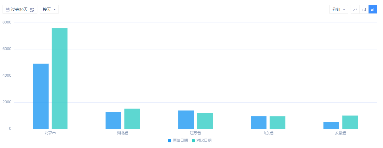 显示分组:可在复选框中修改需要分析的分组。无排序时,选项的排序逻辑为图表中该图例的总值按分析对象之和从大到小排序;有排序时,选项的排序逻辑与当前设置的排序规则一致。