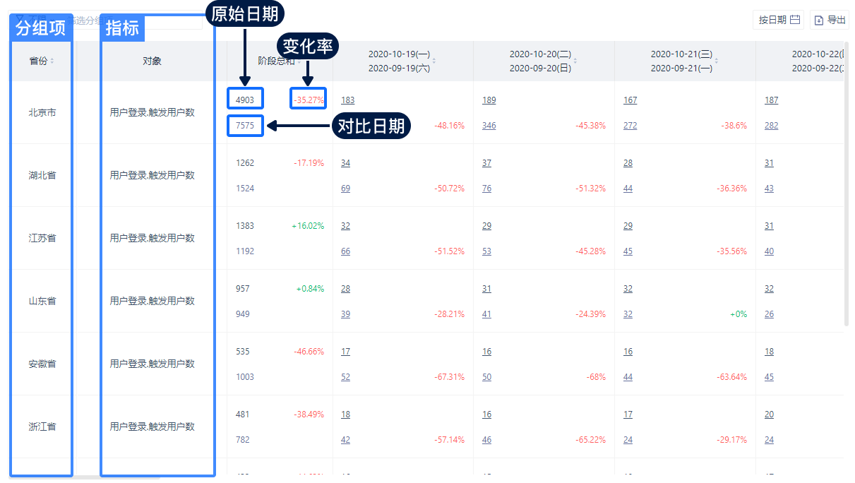以多分析对象、多分组条件为例,说明展示状态下增加日期对比后的展示方式。