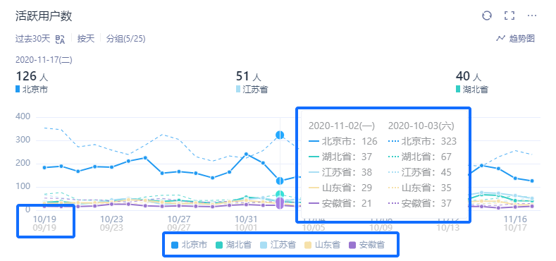 原始日期下的分组数据将以实线表示,对比日期下的分组数据将以虚线表示。时间线上将有原始日期和对比日期两个坐标轴。