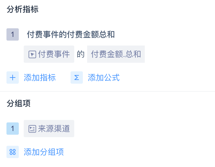 如:选择分析指标为“付费事件的付费金额的总和”,选择分组角度为“来源渠道”,即可分析各渠道的付费总额。