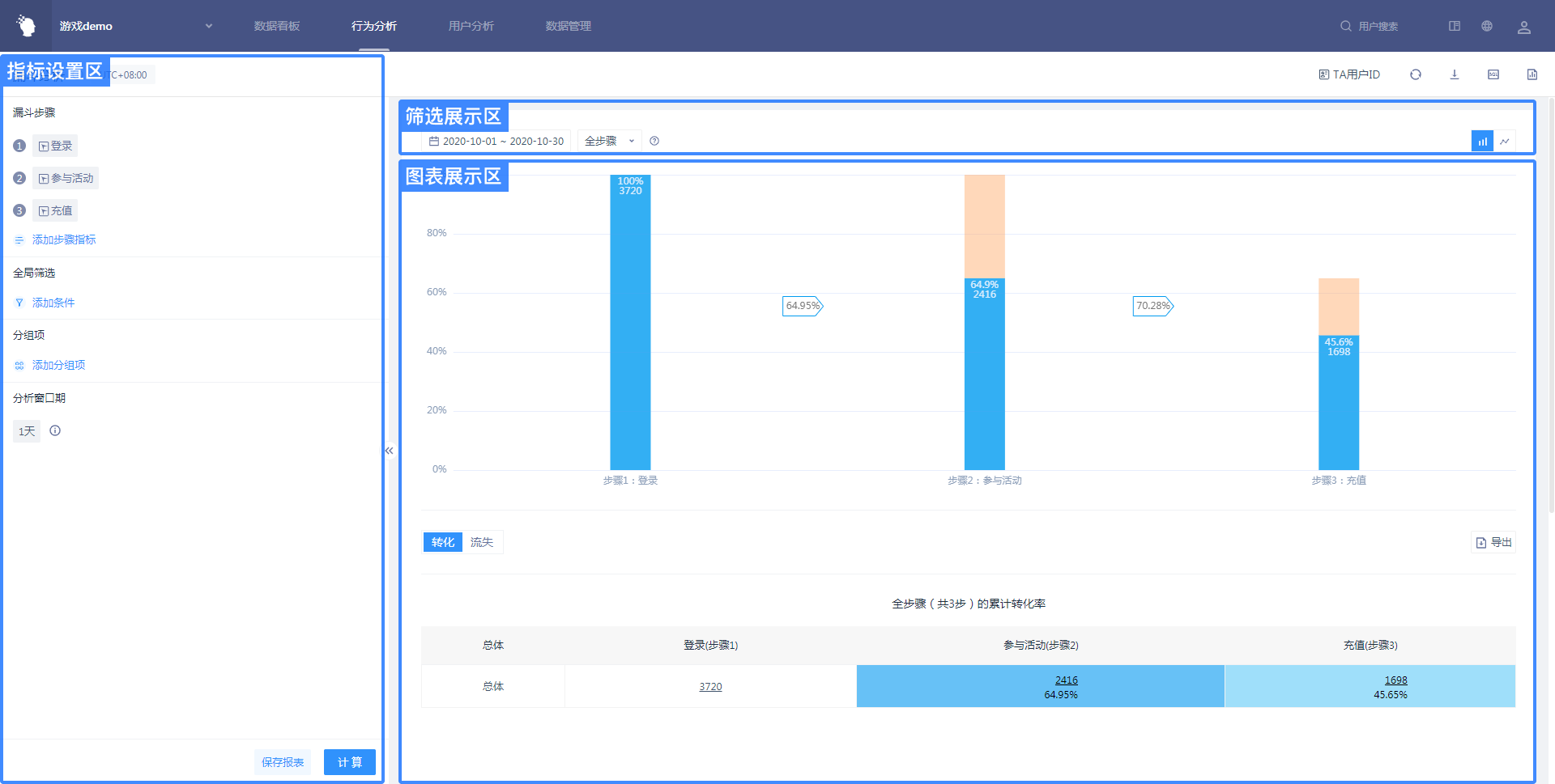 漏斗分析模型由“分析角度设定区、展示筛选区、展示图表区、表格详情区”组成: