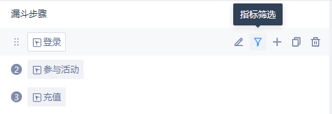 - 可通过鼠标移入某个步骤的“筛选条件”后增加筛选条件,增删改筛选条件的逻辑与事件分析中一致,不再赘述。