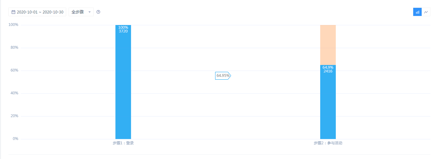 - 在“展示图表区”中可以鼠标移入选择某个分组对象查看详情,并看到对应的各步骤的“单步转化率”