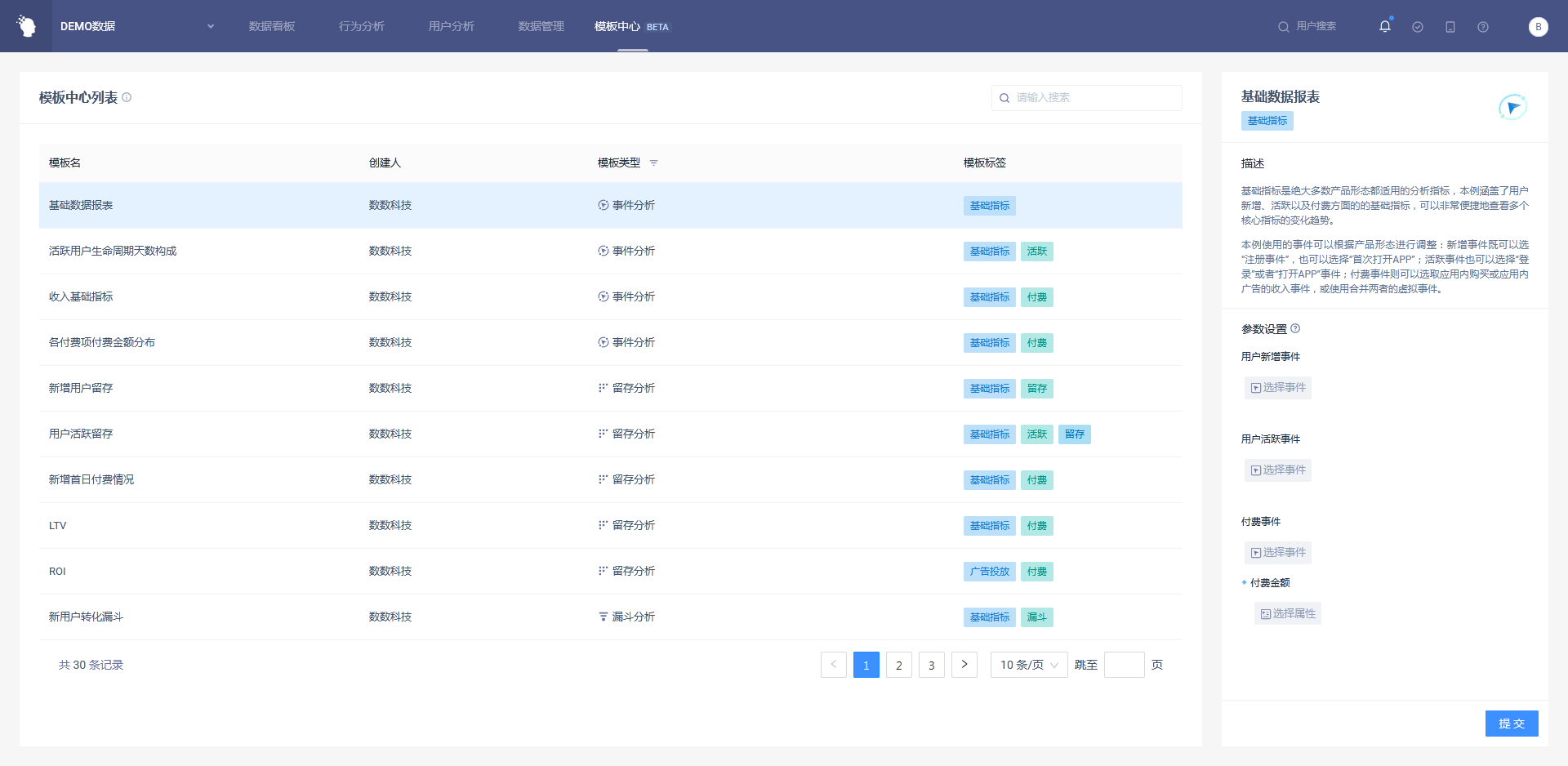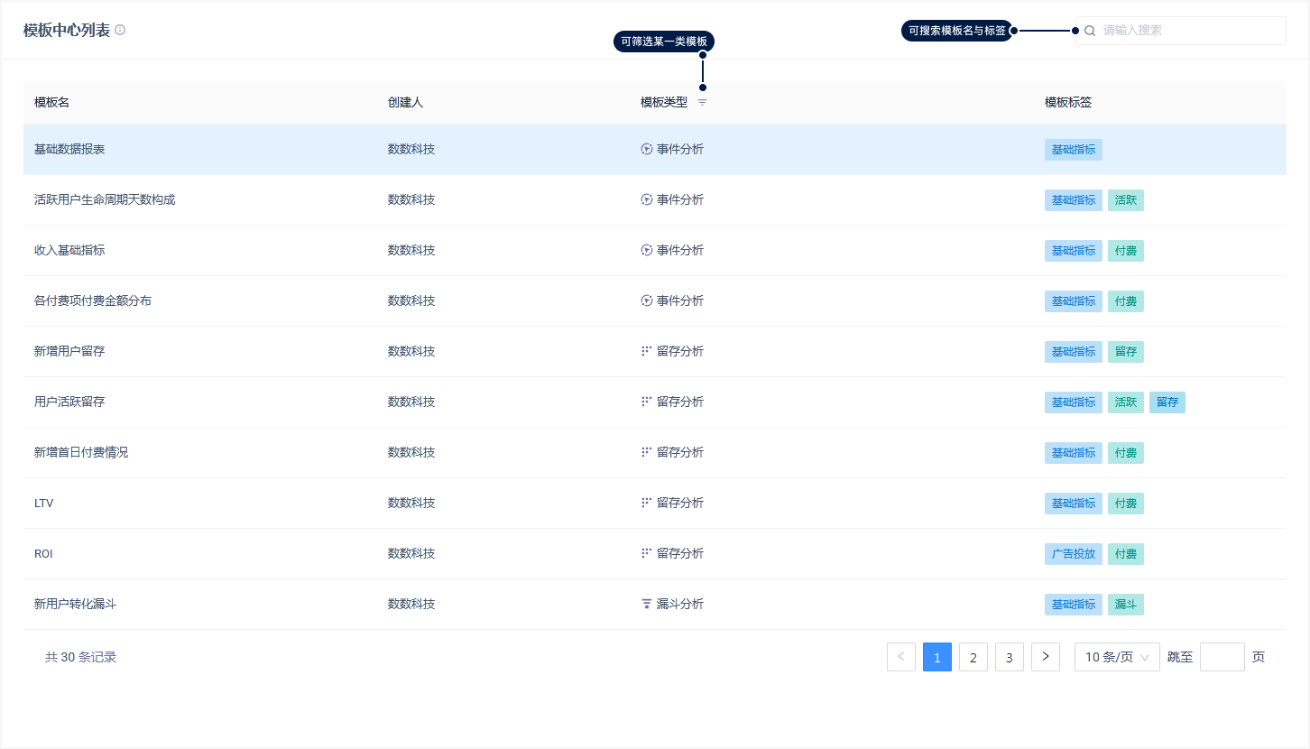 「模板中心」的左半边是模版列表,展示的是模板的基本信息。您可以在模板列表中浏览并查找合适的模板。