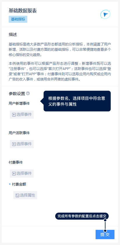 - 参数设置部分罗列了所有需要设置的参数,根据参数的名称,选择当前项目中符合其含义的事件或属性