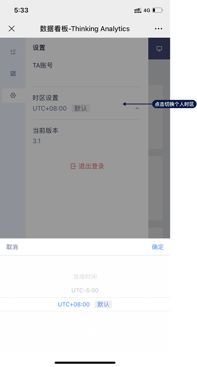 包括帐号信息、时区设置(开启时区设置的项目存在该选项)、当前版本号和退出登录