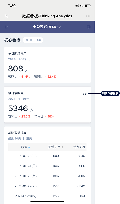 点击报表区域可选中该报表,在右上角出现刷新按钮,点击可刷新单张报表。