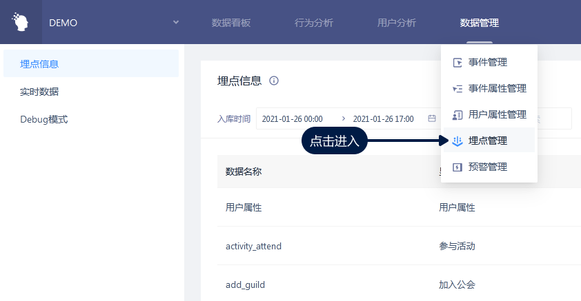 鼠标移入导航栏「数据管理」,点击埋点管理,即可进入埋点管理功能模块。