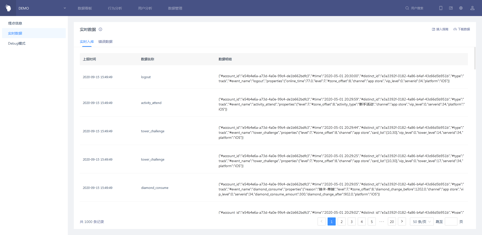 实时数据模块提供查看实时数据上报情况,包括实时入库和错误数据两个子模块。
