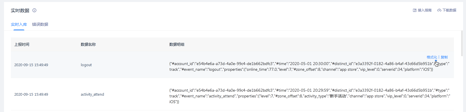 实时入库展示最近 24 小时正确上报数据,当数据导入量较大时,仅展示最近 1000 条数据内容。每行 json 数据都可进行格式化查看、复制操作。
