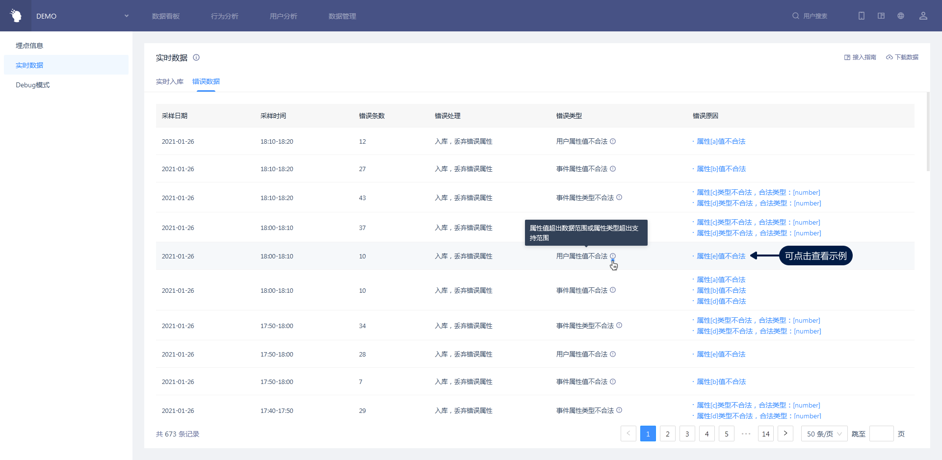 错误数据模块每 10 分钟统计并展示错误上报数据的错误类型、每类错误涉及的数据条数,并针对属性级的错误提供具体的错误原因/错误示例信息。错误数据的展示上限为最近 1000 条错误统计。